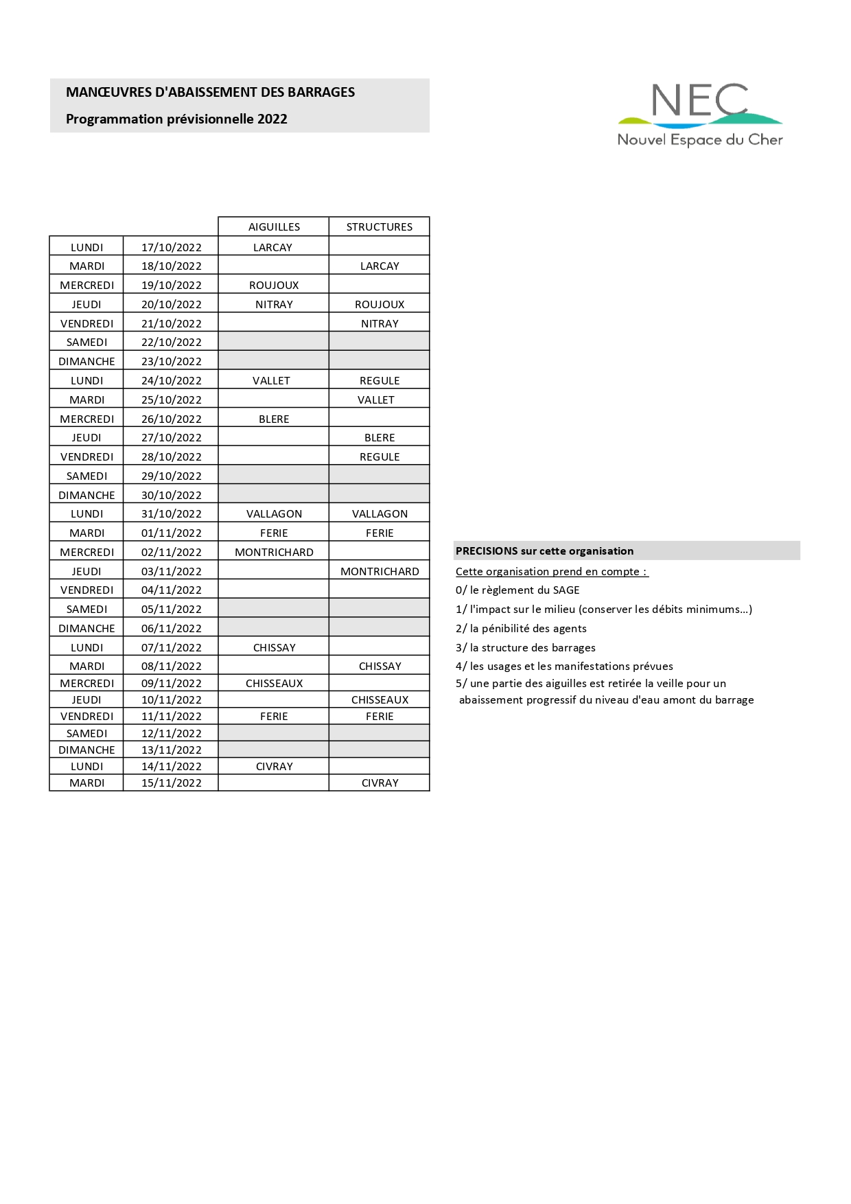 Le planning des manœuvres d’abaissement des barrages sur le Cher, transmis par le Nouvel Espace du Cher.