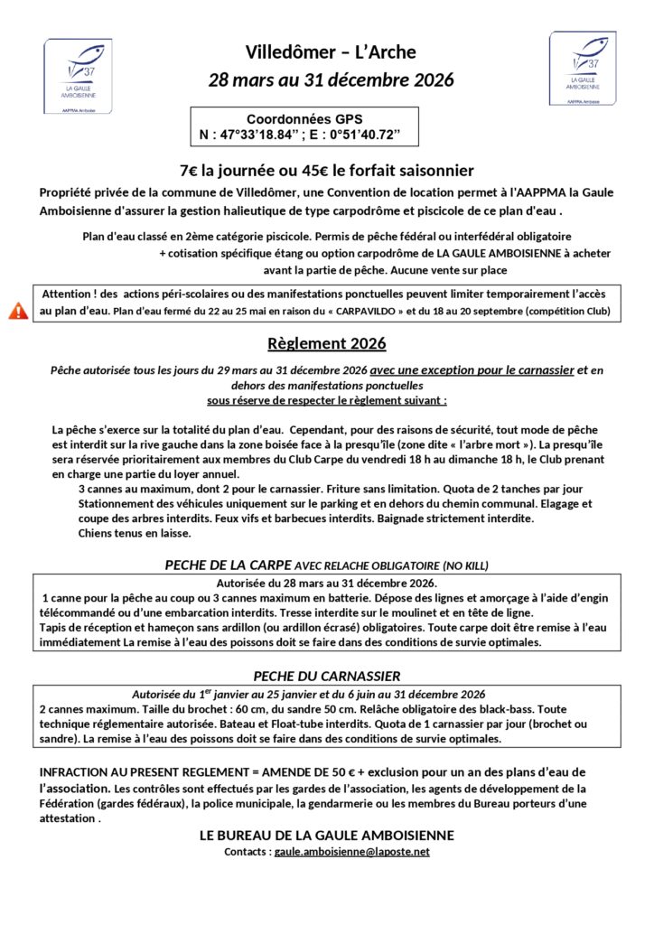 Propriété privée de la commune de Villedômer, une convention (Conseil Municipal du 17/11/2008) permet à l’AAPPMA « la Gaule Amboisienne » d’assurer la gestion halieutique et piscicole de ce plan d’eau.